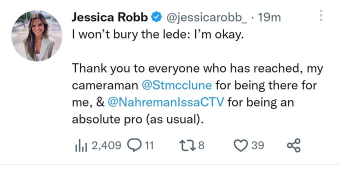 Web 11 hours agoCanadian TV reporter Jessica Robb suffered a frightening medical emergency while reporting from the field in Edmonton. Web 1 hour agoJessica Robb CTV News Illness- Jessica Robb is a Canadian Multimedia journalist and broadcaster and news chaser who works at CTV News. Web 20 hours agoFootage from the Canadian report shows journalist Jessica Robb in the middle of a back-and-forth with anchor Nahreman Issa when she appeared to be unable.